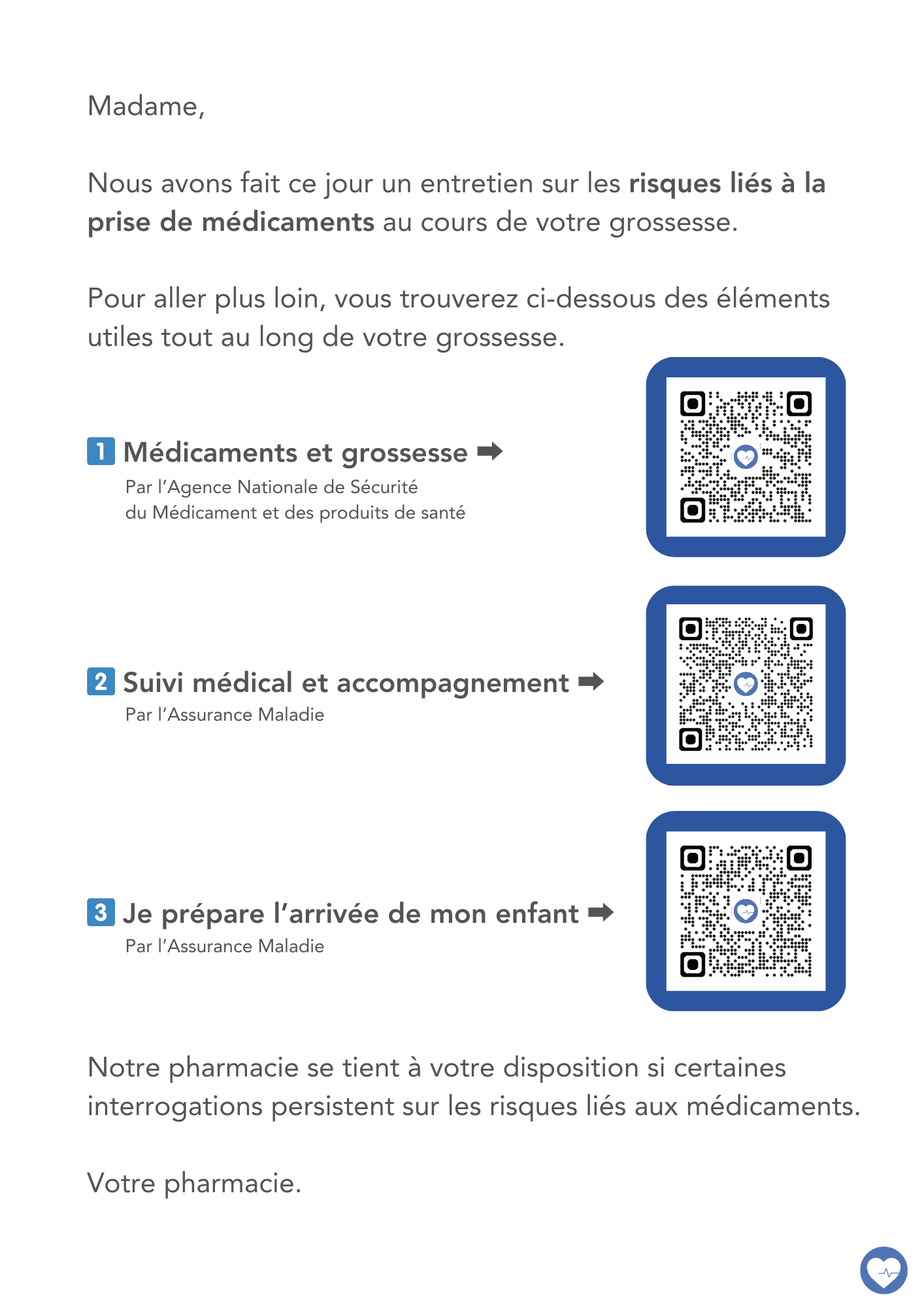 Vous pouvez imprimer les documents utiles ou nous pouvons les envoyer automatiquement par mail. Dans les deux cas la patiente aura le flyer de l'ANSM ainsi que le mail type avec les liens de l'assurance maladie.